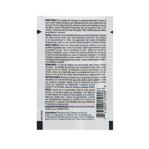 Malibu C Crystal Gel Natural Wellness Hair Treatment preps hair for all chemical services, while removing build-up and discolouration. Immediately rid hair and scalp of damaging deposits! Instantly remove brassiness, leaving a clean canvas for successful colour results. Formulated with a patented, 100% vegan, antioxidant, vitamin-rich complex. Simply mix crystals with warm to discover the benefits of Malibu treatments.Features: